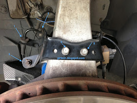 - Remove the bolts holding the bracket to the suspension arm marked #4 & #5 below.